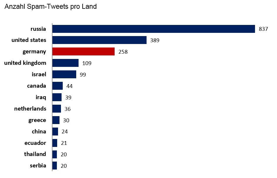Abbildung 6: : Herkunft Tweets, die als Spam klassifiziert wurden, gesammelt zwischen 03.03.2015 und 05.03.2015. Länder mit weniger als 20 Einträgen wurden ausgeblendet. Die Spam-Tweets wurden anhand der Worthäufigkeiten klassischer Spambegriffe und durch das Vorkommen großer Teile des Textes in zeitnaher Aufeinanderfolge identifiziert.