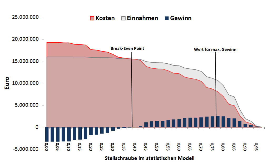 Abbildung 2: Modellergebnis für die Wirtschaftlichkeitsberechnung einer „Churn-Prediction“. Dabei wurde versucht, jene Kunden zu identifizieren, die mit einer großen Wahrscheinlichkeit demnächst kündigen werden. Diese gilt es im Vorfeld durch gezielte Preisnachlässe davon abzubringen. Je größer der Fehler bei der Identifizierung der richtigen Kunden (Model Precision), desto kleiner der zu erwartende Gewinn, weswegen dabei unterschiedliche Classifier getestet werden müssen, worauf anschließend noch ein Modell-Tuning folgt. Im Beispiel wurde mit einer Erfolgswahrscheinlichkeit von 25%, einer Rendite von 120 €/a pro Kunde und Rabatt von 60 €/a pro identifizierten Kunde gerechnet.