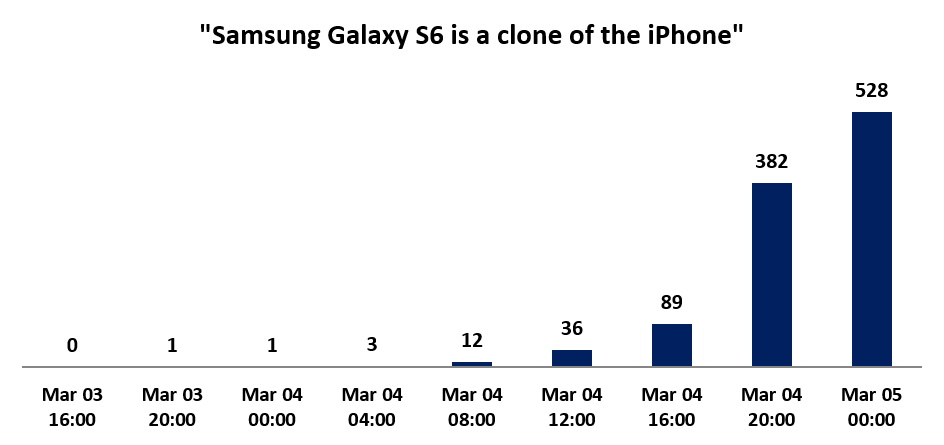 Abbildung 5: Entwicklung von Tweets, die dem Cluster „Samsung Galaxy S6 is a clone of the iPhone“ zugeordnet wurden. Die Benennung ergab sich aus den häufigsten Wörtern innerhalb des Cluster ‚clone‘, ‚iphone clone‘, ’samsung insist‘ (Datenbasis: 60.000 Tweets, gesammelt zwischen 03.03.2015 und 05.03.2015).