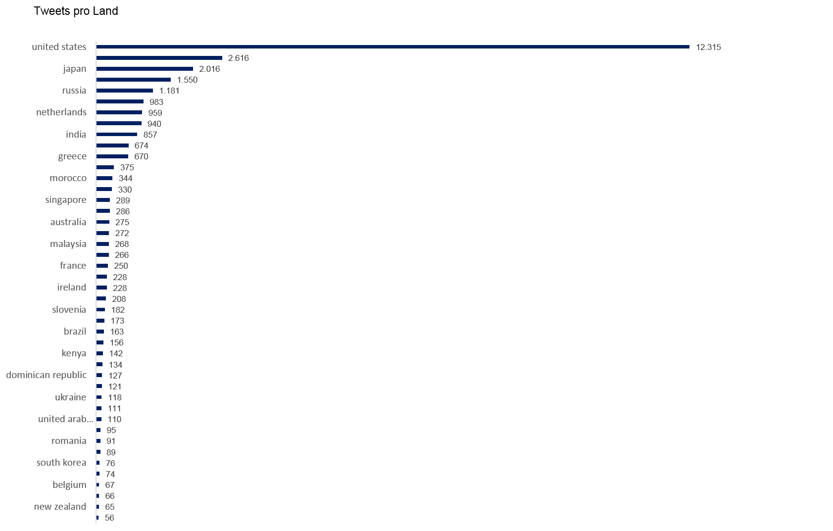 Abbildung 4: Herkunft von ca. 60.000 Tweets, gesammelt zwischen 03.03.2015 und 05.03.2015, wovon sich rund zwei Drittel den Ländern zuordnen ließen. Das verbleibende Drittel wurde ausgeblendet, ebenso Länder mit weniger als 50 Einträgen.