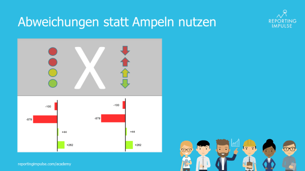 Auf den ersten Blick scheinen Ampeln eine gute Idee zu sein – die Signalfarben werden sofort verstanden, sind simpel und jeder kennt sie aus dem Alltag. Jedoch kann man ein Unternehmen nicht mit dem Straßenverkehr gleichsetzen. Es ist viel komplexer, weshalb mehr vermittelt werden muss als Einzelbegriffe wie „Stopp – Achtung – Los“ oder wie in unserem Fall „gut – mittel – schlecht“. Ampeln vermitteln auch nicht wie ausgeprägt eine Tendenz ist und können sogar zu falschen Interpretationen führen. Es gibt verschiedene bessere Alternativen zu Ampeln. Eine davon ist die Darstellung von Abweichungen in Balken und Säulen in prozentualen oder absoluten Werten. Denn mit eindeutigen Werten und visualisierten Ausprägungen sagen sie viel mehr aus und bieten damit einen hohen Mehrwert.