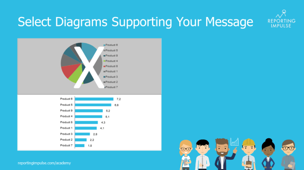 Why do we create diagrams? To deliver a specific message. This goal is achieved even better if you choose a diagram that supports the information. For example, the pie chart is the best way to display parts of a whole. We recommend that you display only two elements and distinguish them in color. Although bar charts and column charts are similar, their application is different: the former can show good structures and the latter is better suited to time histories. Line graphs show trends and correlations can be represented by scatter plots, for example. And this is only the beginning to visualize information smartly.