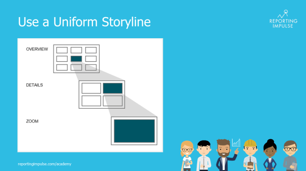 The quality of your dashboard depends on how well thought-out your storytelling is. However, the basic structure is always the same: from the overview on a landing page, you can access the detailed level(s) via filters or drill downs and finally the zoom level(s). Your storytelling concept should be based on the tasks, questions and experiences of your user group. These three aspects can be used to categorize users, as the contents of the individual groups also differ. For example, a manager needs fewer details and interactions than a data scientist who needs a lot of information to perform a thorough analysis.