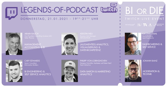 Am Donnerstag, 21.01.2021 war es wieder soweit. Es gab unser zweites Twitch LIVE Event mit unseren Legends of Podcast Armin Rauch (Vetter Pharma), Kerstin Neu (INFOMOTION), Philipp Baron Freytag von Loringhoven (Team Advertico) & Cary Edwards (Information Builders).
