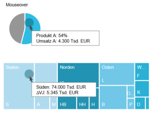 Die Integration von interaktiven Aktivitäten in das Dashboard bietet viele Vorteile. So hilft eine Navigationsleiste den Überblick zu behalten, wenn man sich in tiefere Ebenen reindrillt. Zudem dient sie auch als eine intuitive Steuerung, in der man beliebig Ebenen überspringen kann. Viel mehr hilft sie noch bei der Erstellung und Strukturierung des Dashboards, weil jede Seite einen Namen braucht und jeder Pfad definiert werden muss. Wir empfehlen die Navigation und Interaktion größtmöglich zu vereinfachen – es reichen meist drei Filter und drei Zeilen im Titelkonzept. Auch innerhalb von Diagrammen liefert Interaktion in Form von (kombiniertem) Highlighting, Mouse over oder Drill in Funktionen einen höheren Mehrwert.