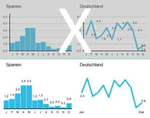 Unser Ziel ist es, dass jeder schnell und leicht alle Informationen von unserer Graphik ablesen kann. Dies wird leider oft durch überflüssige Visualisierungen verhindert. Suchen Sie sich eine Graphik aus und überlegen Sie sich, was man nicht unbedingt braucht und dennoch kein Informationsverlust bedeutet. Sind farbige Hintergründe und unterschiedliche Farben, 3D-Effekte, Legenden, Rahmen und Führungslinien wirklich notwendig? Visualisieren Sie schlank und reduzieren Sie die Komplexität der Graphik Schritt für Schritt.
